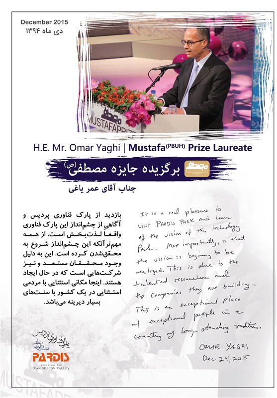 پروفسور عمر یاغی برگزیده جایزه مصطفی(ص) 2015، که پیشتر در نخستین هفته جایزه مصطفی(ص) از پارک فناوری پردیس بازدید کرده بود به تازگی موفق به دریافت نوبل شیمی 2025 شده است.